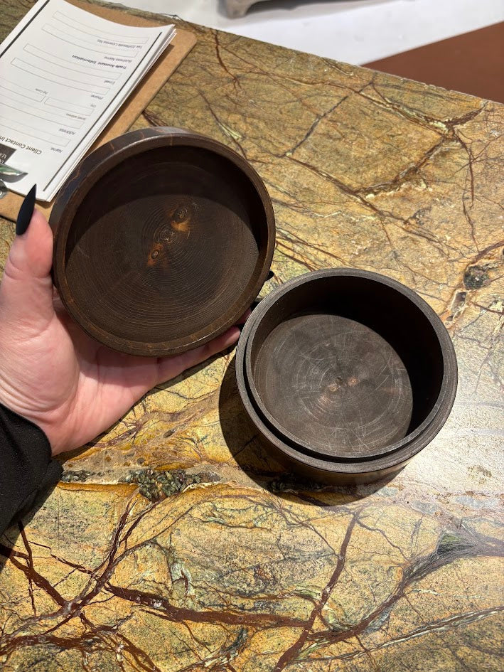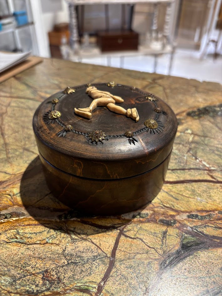 French Round Wood Carved Box with Skater Surrounded by Brass Stone and Studs Circa 1940s