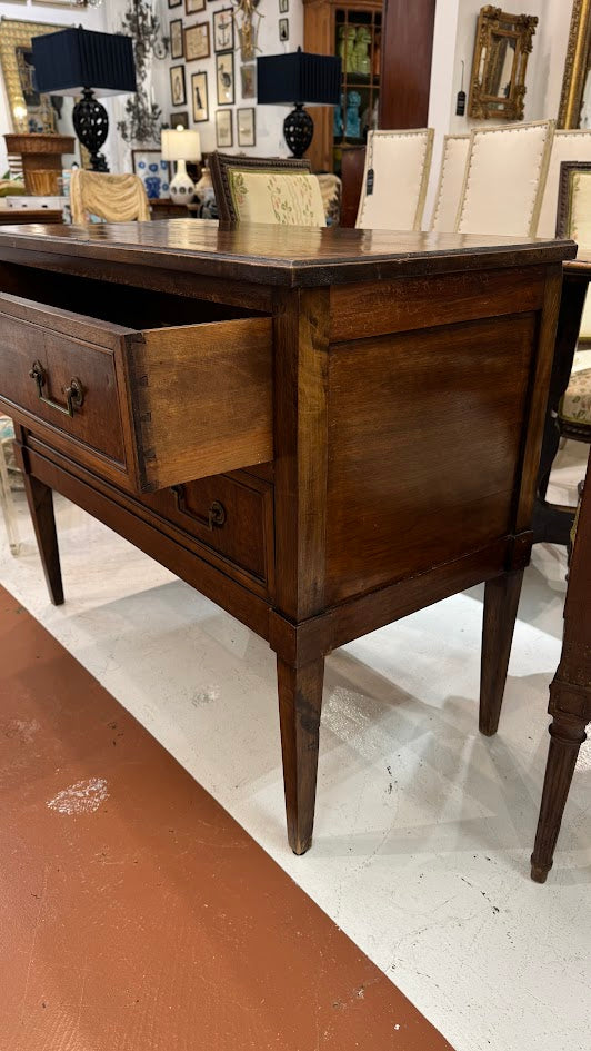 Crafted in France circa 1790, this Louis XVI walnut sauteuse features clean neoclassical lines, square tapered legs, and original bronze drop pulls. The two drawers offer elegant storage, while the warm walnut grain adds depth and character. A refined accent piece ideal for use as a nightstand, entry table, or hallway statement.