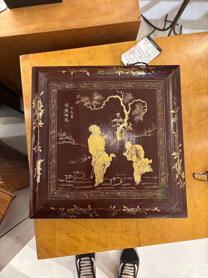 This finely crafted Chinese lacquer box houses a complete porcelain sweetmeat set, delicately hand-painted and beautifully preserved. With its rich red lacquer and ornate metalwork, it makes an exceptional decorative or functional accent.