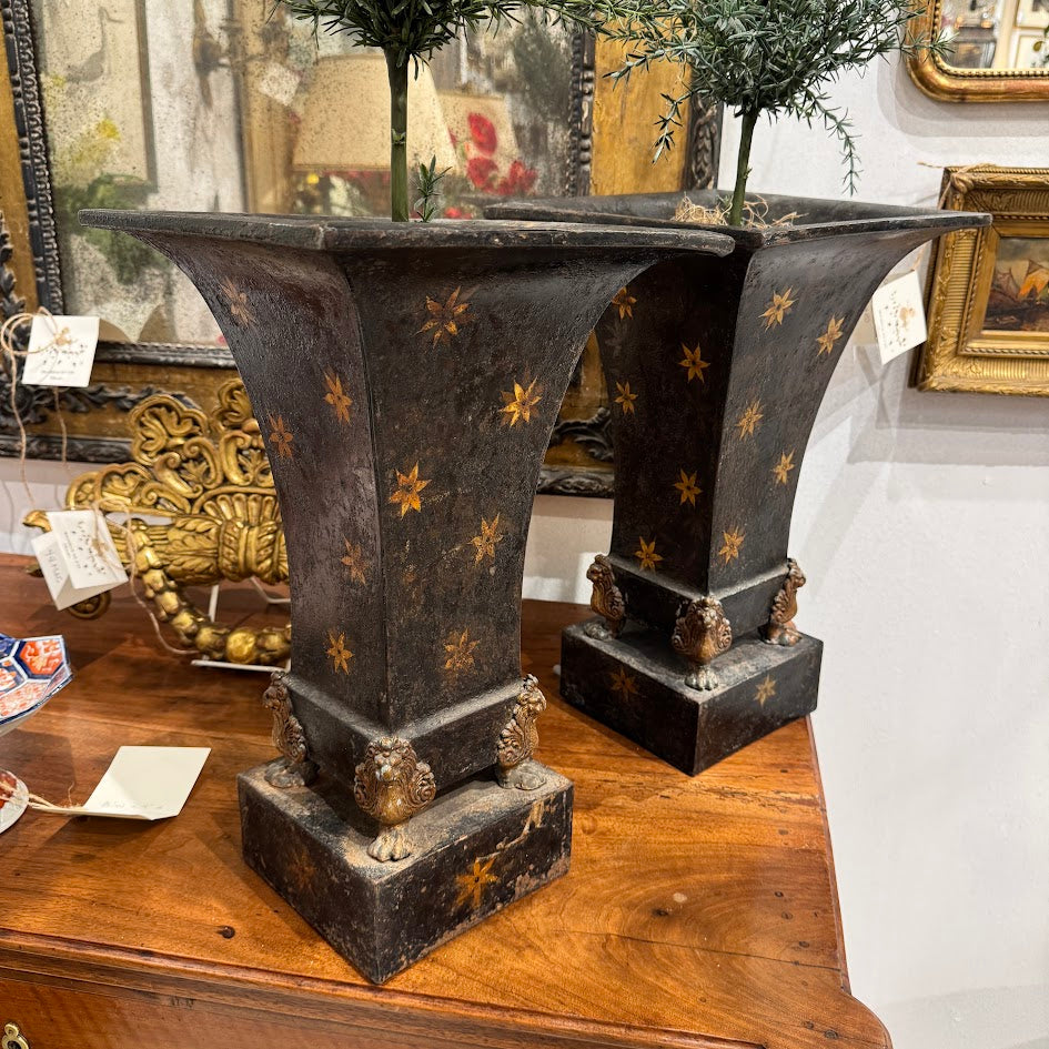 A striking pair of 18th century French tole urns, hand-painted with classical motifs and gracefully aged patina. Their elegant silhouettes and decorative flourishes exemplify period craftsmanship, ideal for flanking a mantel, console, or entryway vignette.