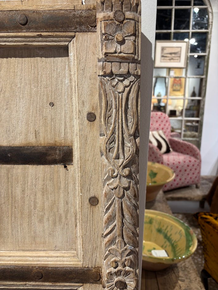 This pair of early 1900s Spanish/Portuguese doors captures the rustic elegance of Iberian architecture. Hand-carved from solid wood with timeworn patina, the panels feature intricate geometric and floral reliefs that hint at Moorish influence, blending Old World grandeur with artisan craftsmanship.