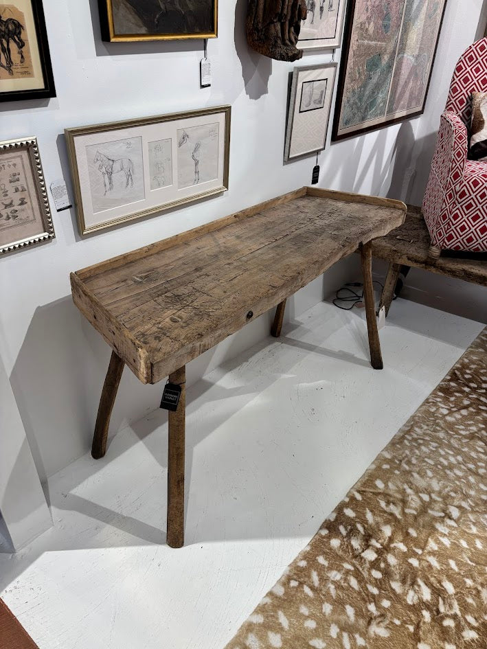 This Primitive Console Table from Hungary showcases the rustic beauty and timeworn character of early European craftsmanship. Made from solid wood with visible joinery, worn edges, and a natural patina, this console exudes a sense of quiet strength and history. The proportions are generous yet unfussy, making it a versatile piece for entryways, kitchens, or behind a sofa.