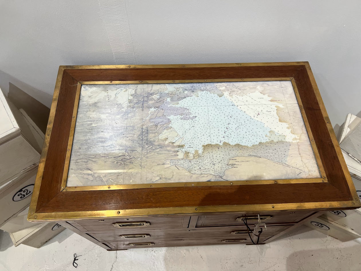 Anchor your décor in history with this Vintage English Ship Captain’s Campaign Chest. Its petite dimensions—29.5" wide × 17.5" deep × 28.5" high—house a removable pull-out slide and a fascinating chart under glass, evoking the adventure of nautical exploration. Priced at $2,395, it's rich in character and storytelling power, ideal as a display piece or functional storage.